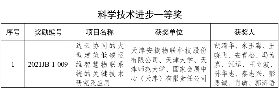 日前,2021年天津市科学技术奖获奖名单公布,由天津安捷物联科技股份有限公司联合天津大学、天津师范大学、国家会展中心(天津)有限责任公司申报的《边云协同的大型建筑低碳运维智慧物联系统的关键技术研究及应用》项目,荣获“天津市科学技术进步一等奖”。
